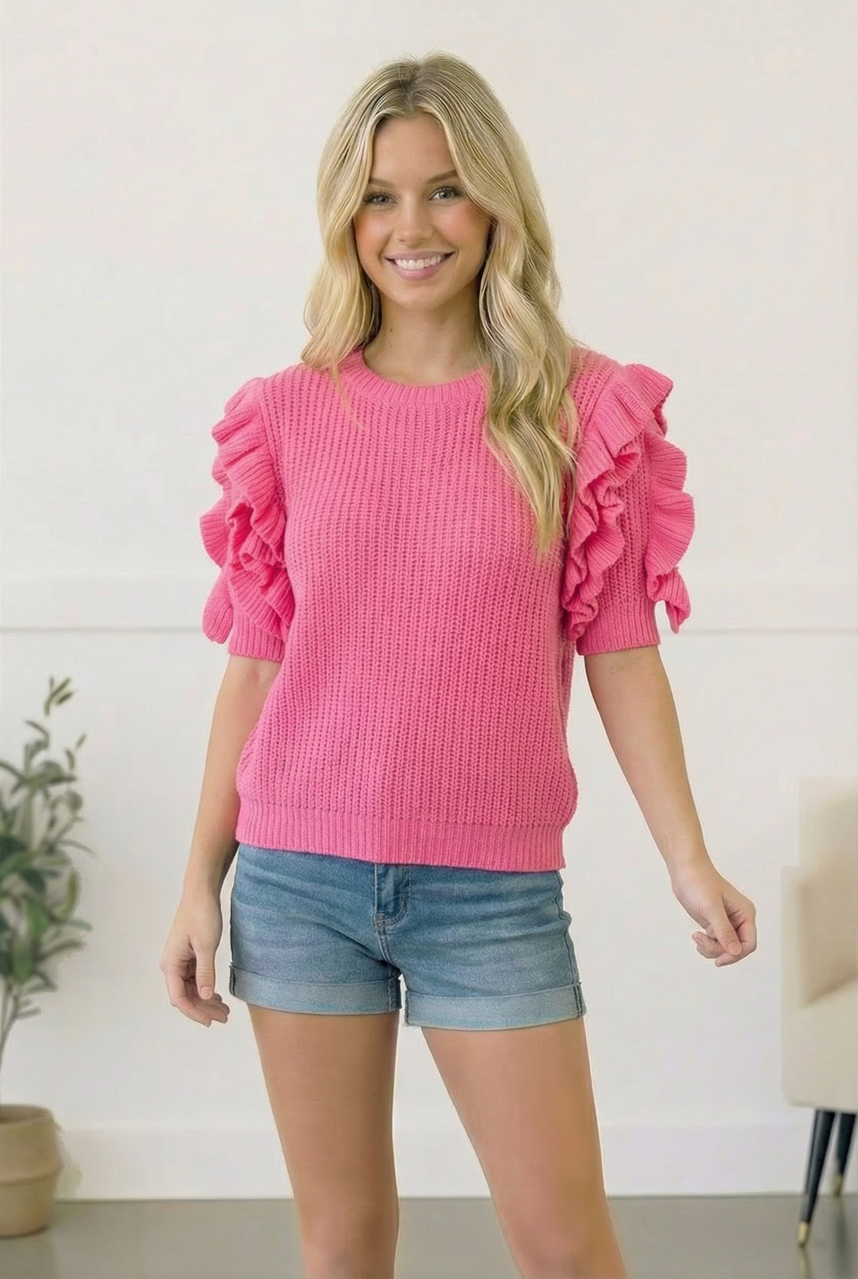 Playful and feminine, this knit blouse features statement ruffle sleeves that add the perfect touch of charm to an everyday silhouette. The soft, textured knit offers a comfortable fit while the vibrant color brings a fun pop to any outfit. Easy to pair with denim or shorts, this eye catching top is perfect for casual days, brunch dates, and everything in between.