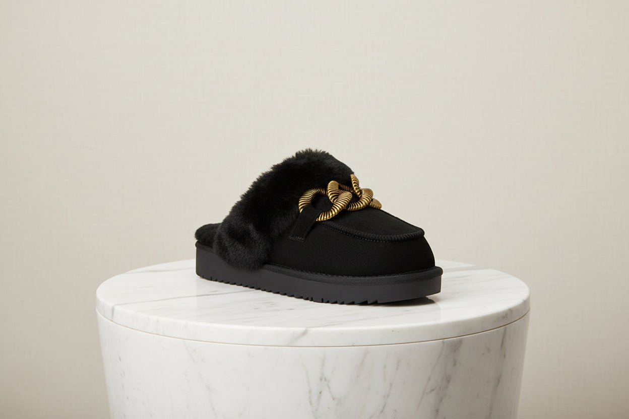 Meet the slipper that understood the assignment: cozy, chic, and just the right amount of extra. The Taos Lounge Mule in Black wraps your feet in ultra-soft faux fur while giving you that elevated, designer-inspired look with its bold gold chain detail.
