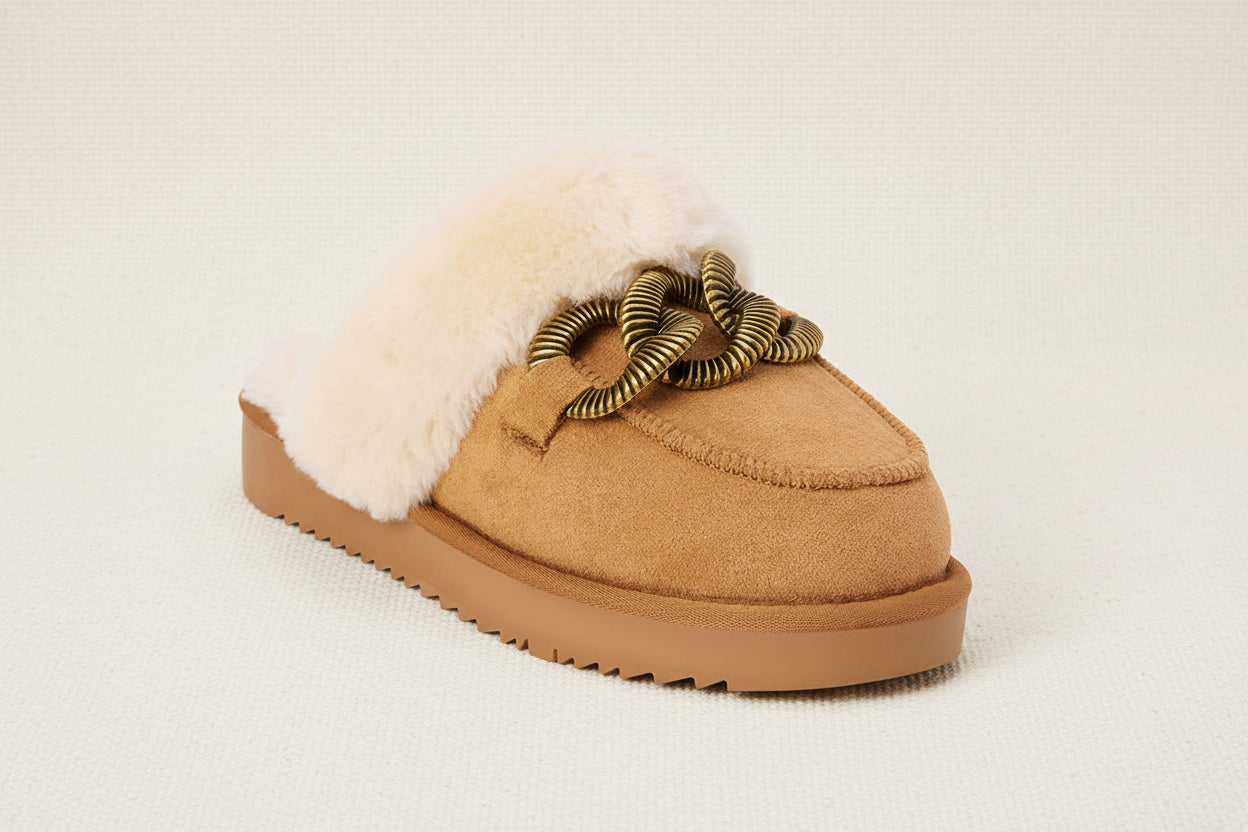 Meet the slipper that understood the assignment: cozy, chic, and just the right amount of extra. The Taos Lounge Mule wraps your feet in ultra-soft faux fur while giving you that elevated, designer-inspired look with its bold gold chain detail.