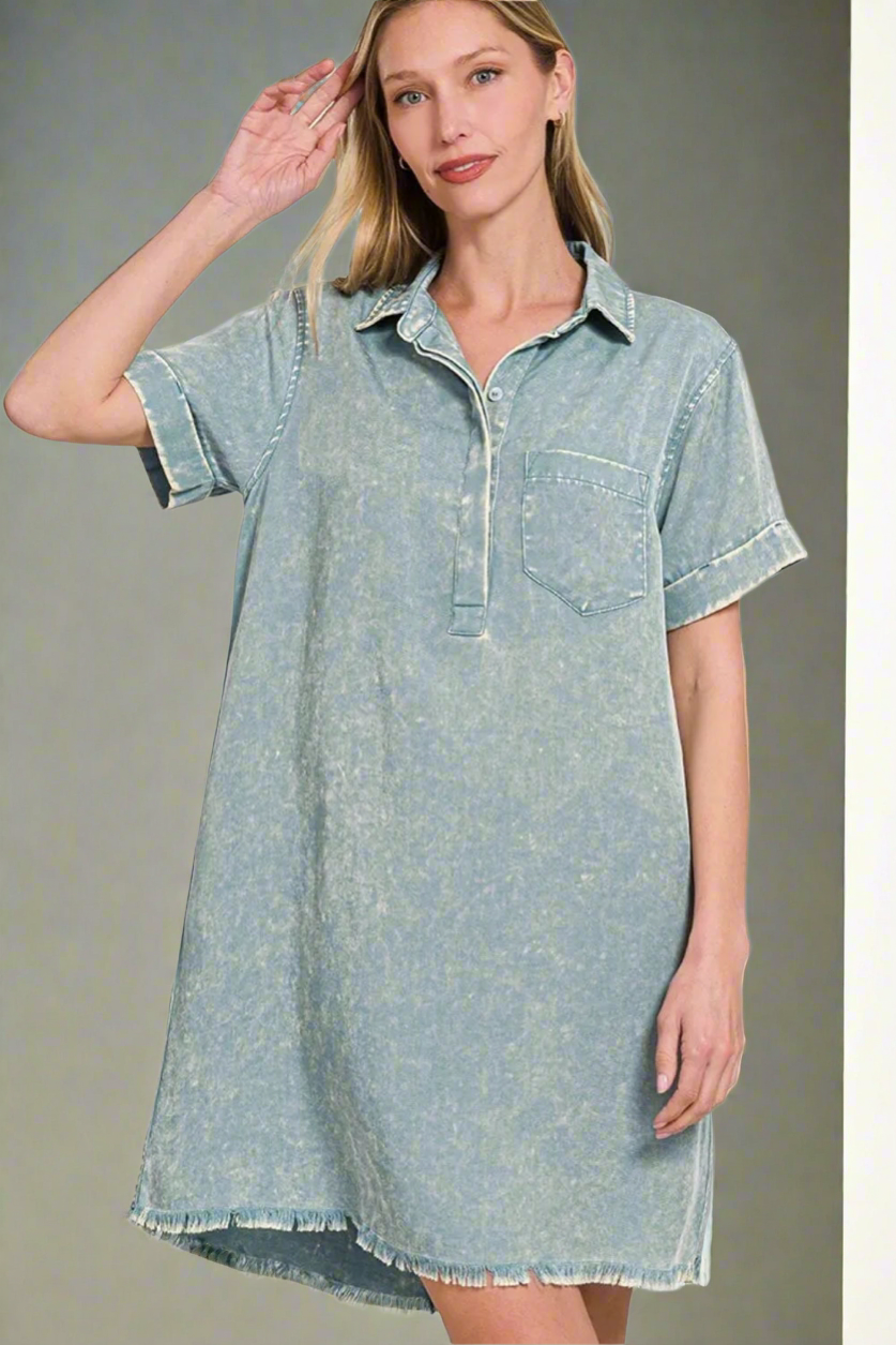 This fashion shirt dress features a unique acid-washed pink denim construction that gives it a vintage-inspired look. Made from quality cotton denim material, the dress offers both style and comfort. The relaxed silhouette includes classic shirt dress details like a collared neckline, front pocket, and half-button placket. The raw hem adds an edgy, contemporary touch while the short cuffed sleeves keep it casual and perfect for warm weather. The washed treatment creates a lived-in feel that's both fashionable and easy to style.